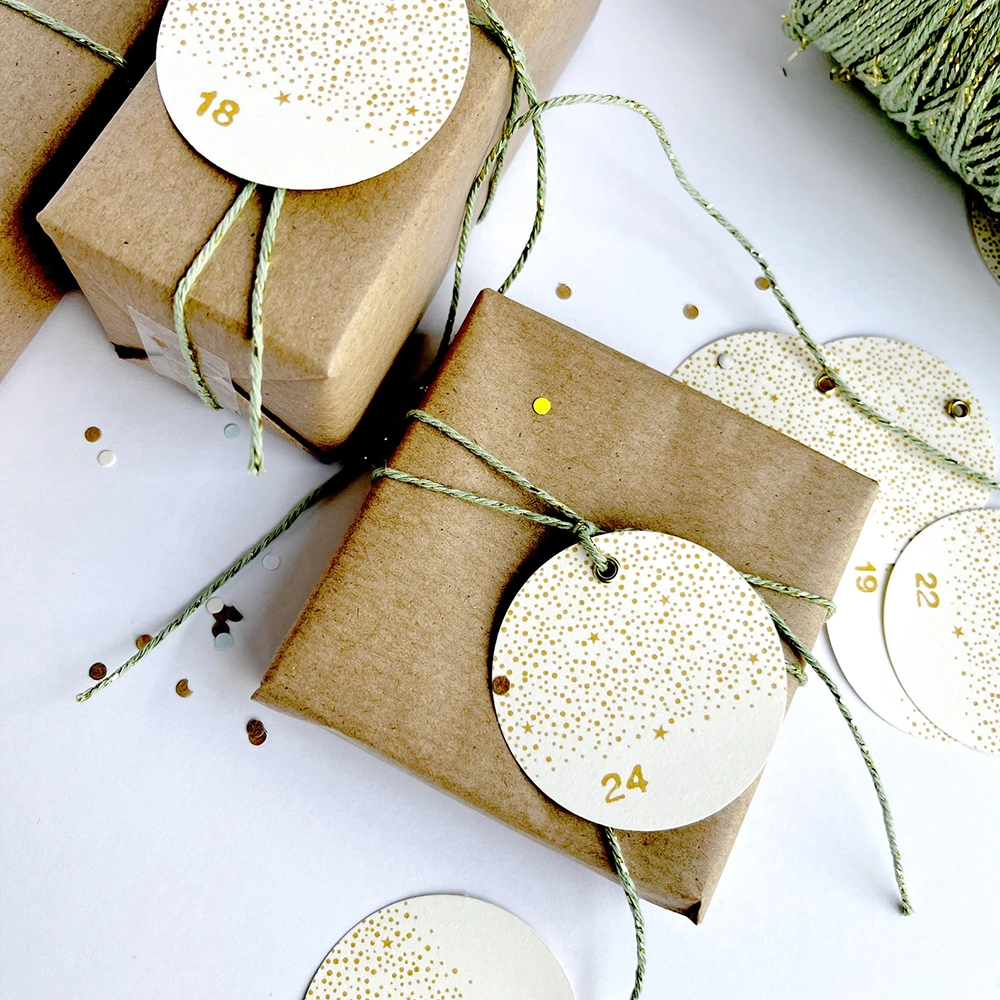 Gestalte deinen DIY-Adventskalender mit 24 funkelnden Zahlenanhängern im stilvollen Stempel-Design.