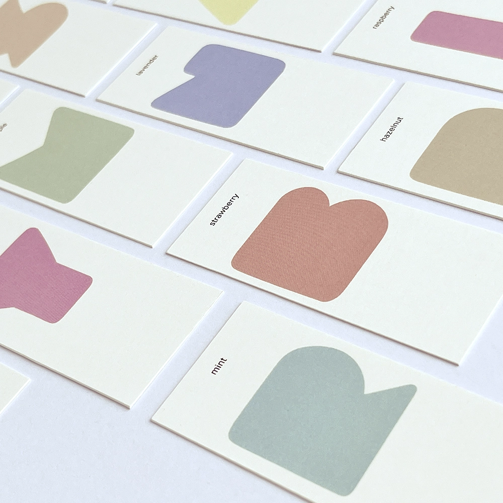 Illustrierte Buchstaben & Zahlen in Pastellfarben mit Eiscreme-Sorten.