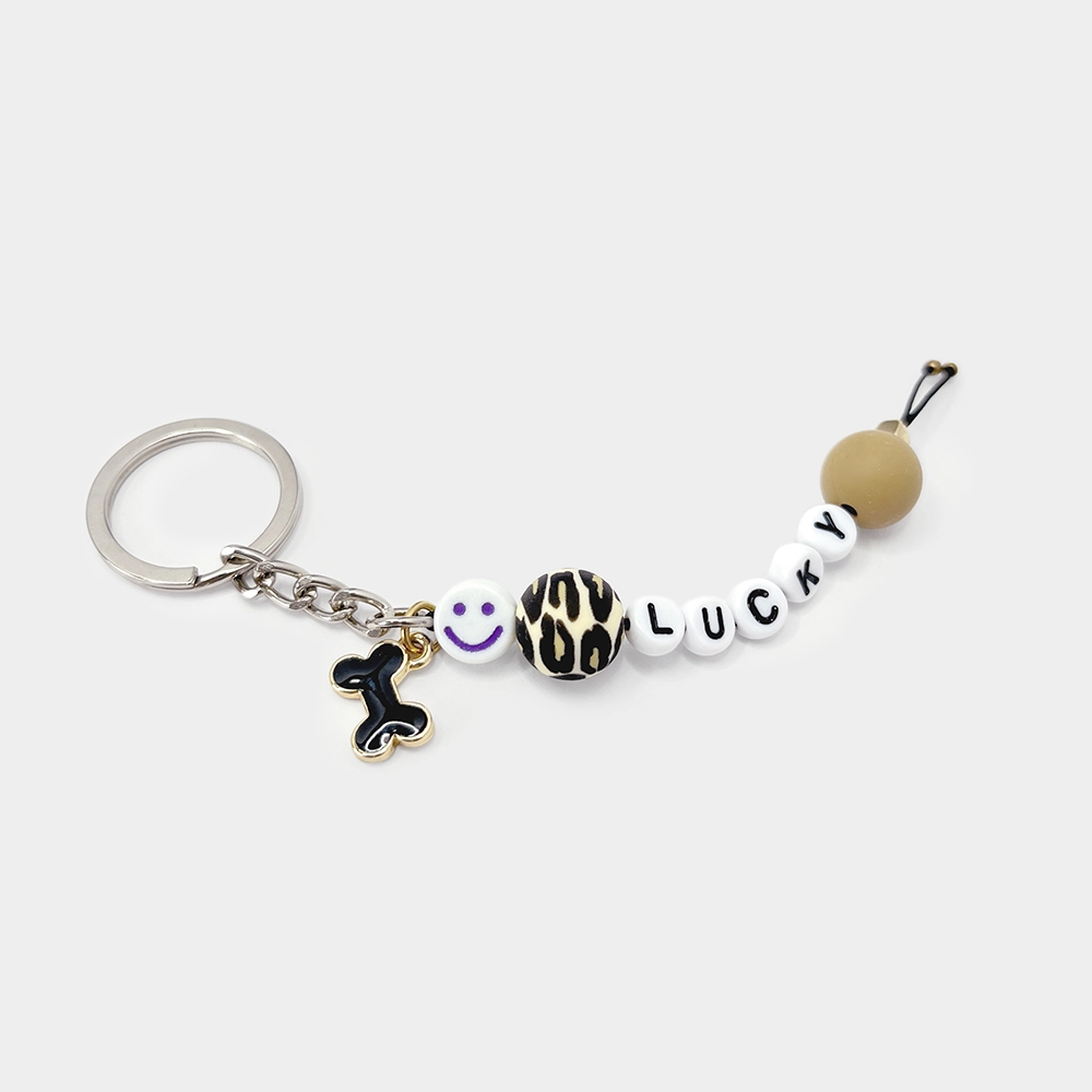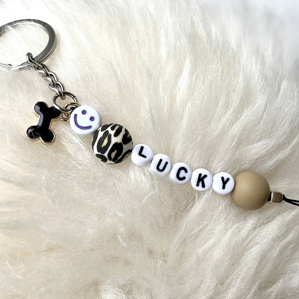 Material: Edelstahl-Schlüsselanhänger, Silikonperlen, Emaille-Metall Hundeknochen Anhänger, Kunststoff-Buchstabenperle, Glasperlen, goldfarbene Metallperle, Nylonschnur