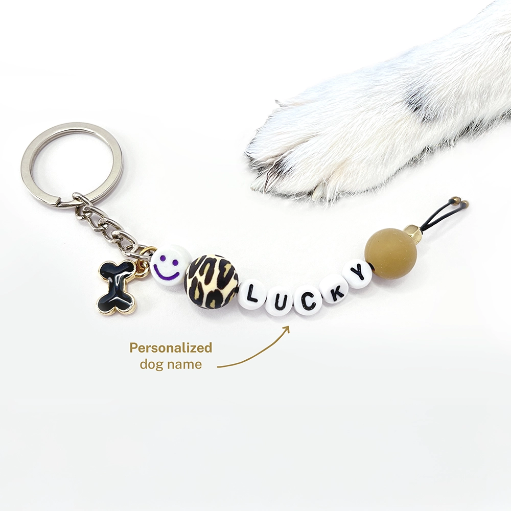 Trage den Namen deiner Fellnase immer bei dir! Dieser handgefertigte Schlüsselanhänger besteht aus bunten Silikonperlen, einer trendigen Leo-Style-Perle, hochwertigen Buchstabenperlen mit dem Hundenamen deiner Wahl, einem robusten Edelstahl-Schlüsselring und einem süßen Hundeknochen-Anhänger aus Emaille – wie ein kleines Leckerli.